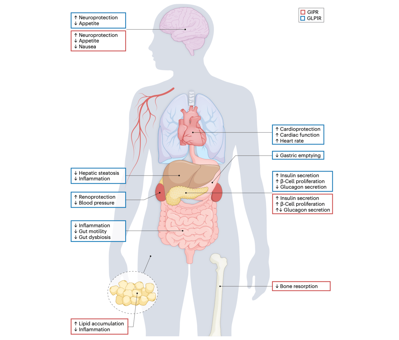 GLP-1 is part of a family of incretin hormones that also includes GIP (Glucose-dependent Insulinotropic Polypeptide). While GLP-1 has received more attention, GIP also plays important roles in metabolism, bone health, and inflammation. GIP receptors are distributed throughout the body in adipose tissue, bone, the immune system, and the central nervous system. The therapeutic exploitation of both GLP-1 and GIP pathways is now yielding exciting new treatment possibilities.